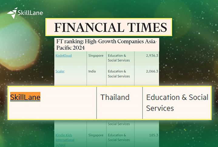 SkillLane has been recognized as one of the fastest-growing companies in the Asia-Pacific region by the prestigious Financial Times in 2024. Notably, SkillLane is the only Thai company in the Education & Social Service sector to make this list, alongside education companies from Singapore, Japan, South Korea, and India. We secured the 392nd position out of 500 companies, with an impressive growth rate of 104.5%.